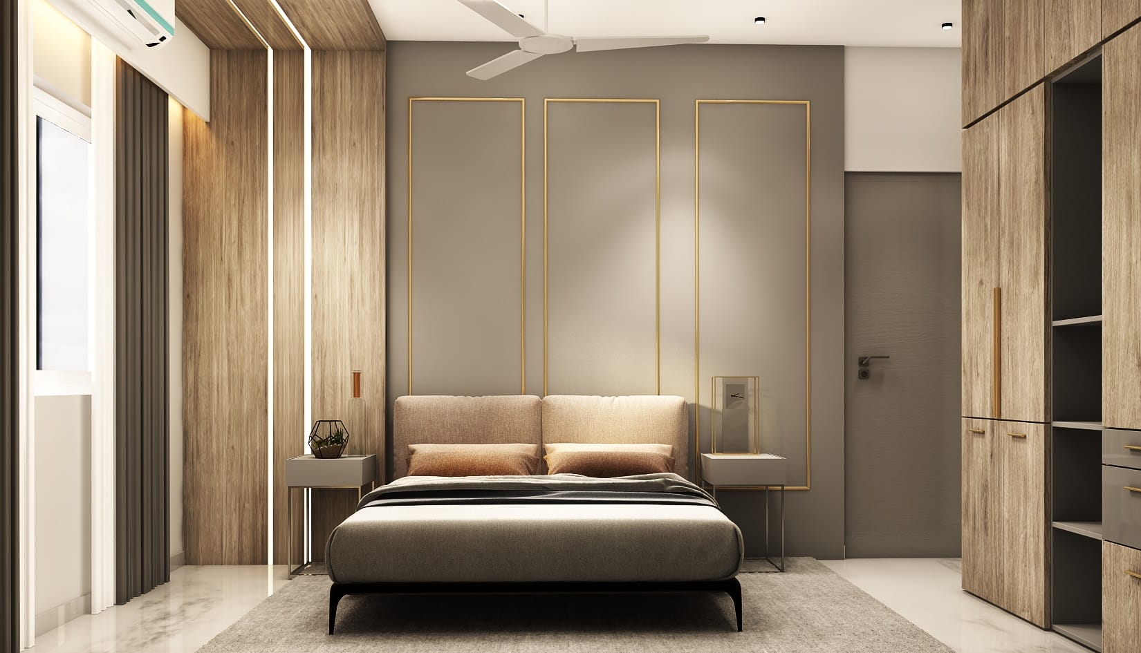 - Bedroom doors will be made of teak wood frame and paneled skin shutters.